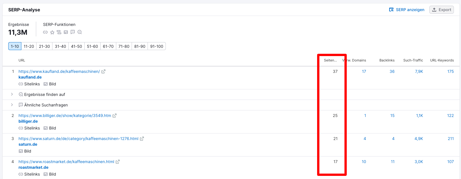 Wir haben die Beziehung zwischen Rankings und Domain Rating untersucht und eine kleine positive Korrelation zwischen den beiden gefunden. Wir arbeiten mit mehreren SEO-Tools. In diesem Fall nehmen wir SemRush und untersuchen das kommerziell gesucht Wort “Kaffeemaschine kaufen”.