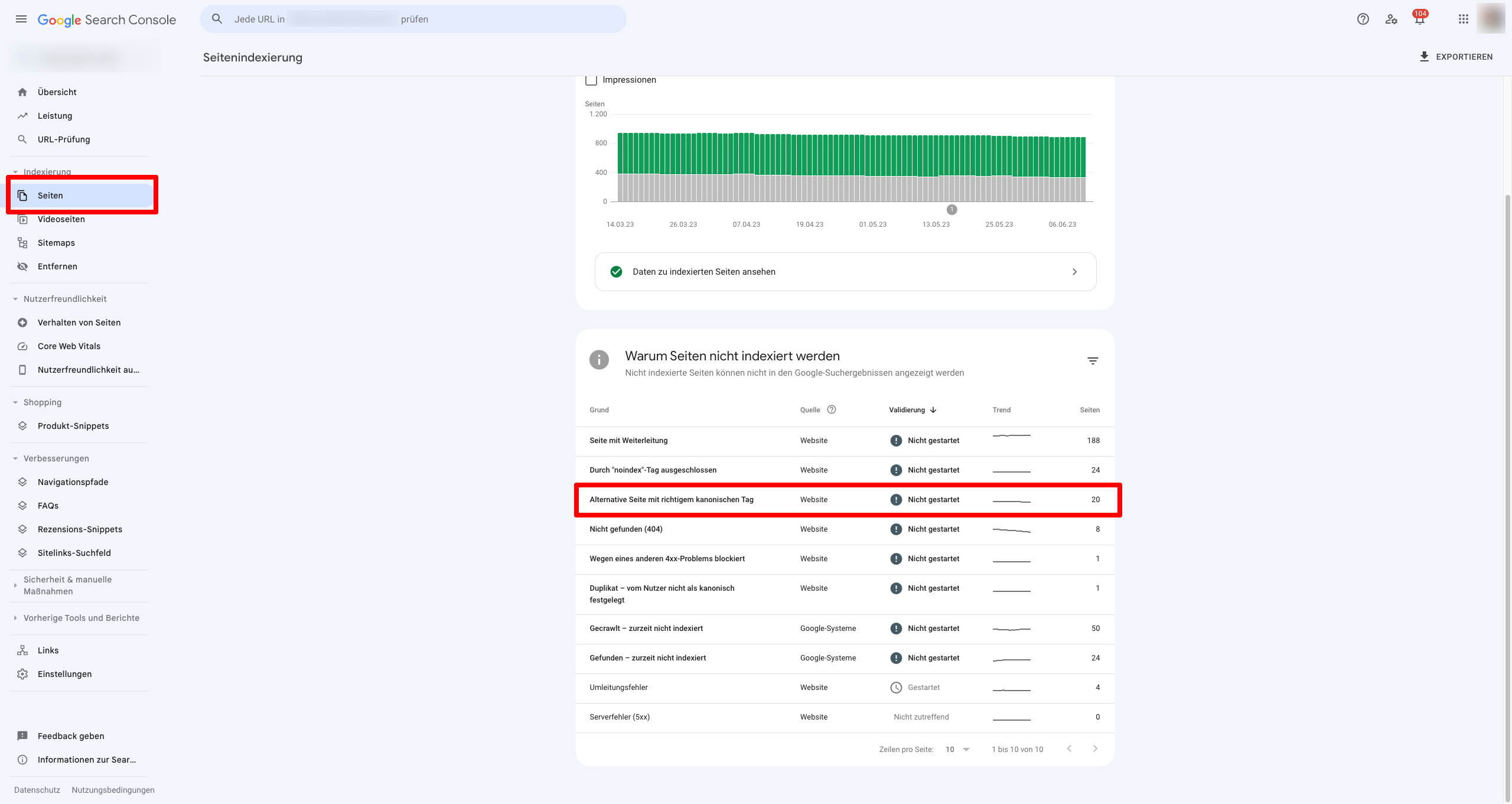 Nun ist es nicht immer einfach festzustellen, wann eine Seite von Google als doppelter Inhalt gewertet wird. Daher nutzen wir nun wieder die Google Search Console (GSC). Hier können wir auf Seiten → Alternative Seite mit richtigen kanonischen Tag klicken.