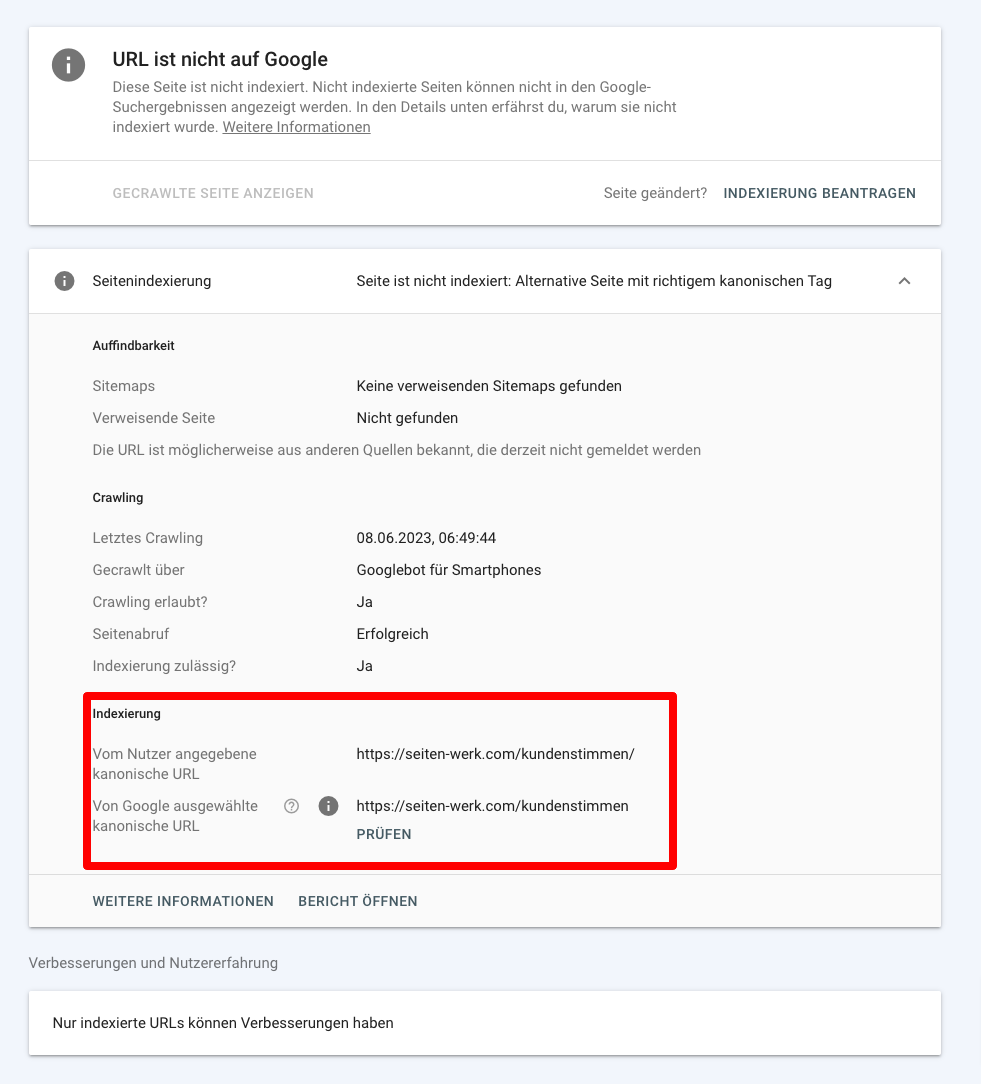 So zum Beispiel auf dem folgenden Bild zu erkennen. Google sieht hier eine URL ohne “/” am Ende, und verweist dann auf die URL mit dem “/” am Ende. Dies ist nun schon ein Hinweis für eine alternative Seite mit kanonischem Tag.
