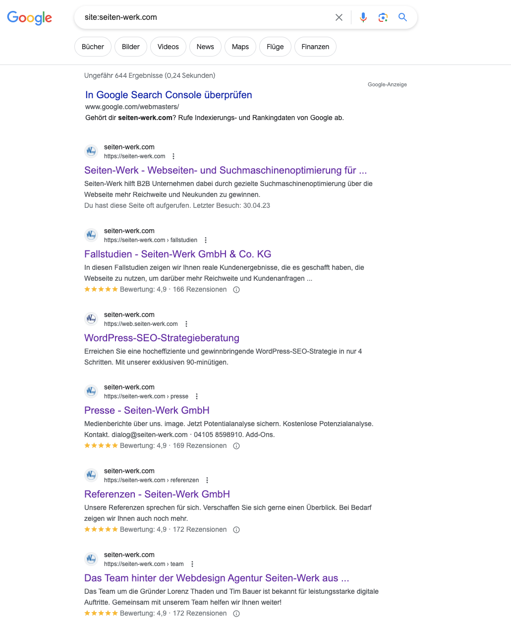 Aber selbst wenn Google über Ihre Webseite Bescheid weiß, ist es möglich, dass es die Seite, die Sie ranken möchten, nicht kennt. Überprüfen Sie, ob Google diese Seite kennt, indem Sie nach site:ihrewebseite.com/eine-spezifische-unterseite suchen.