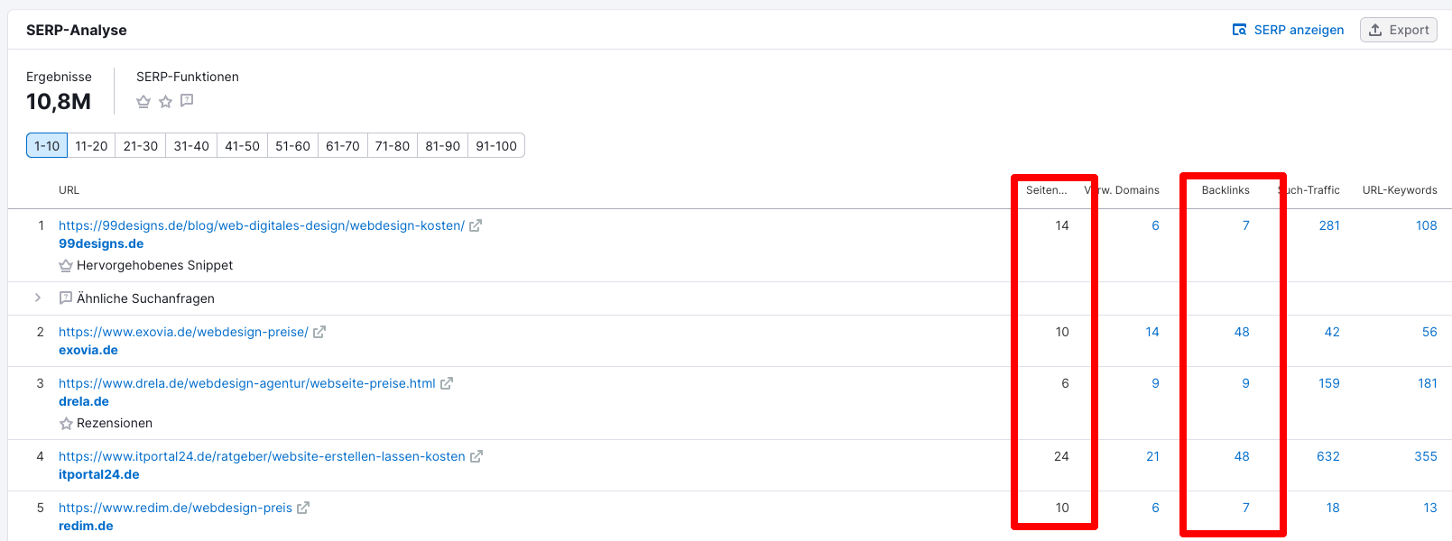 Man muss also beachten, dass Google ganz individuelle Metriken zur Hand zieht, um eine Webseite zu bewerten. Hier ein Beispiel mit dem Keyword “Webdesigner Preise”, wo dies auf den ersten Blick absolut nicht einleuchtend erscheint: